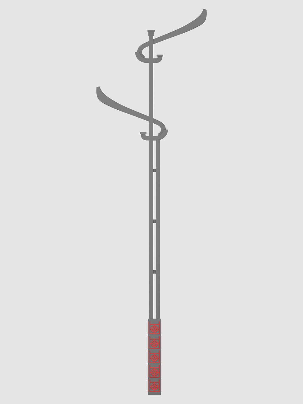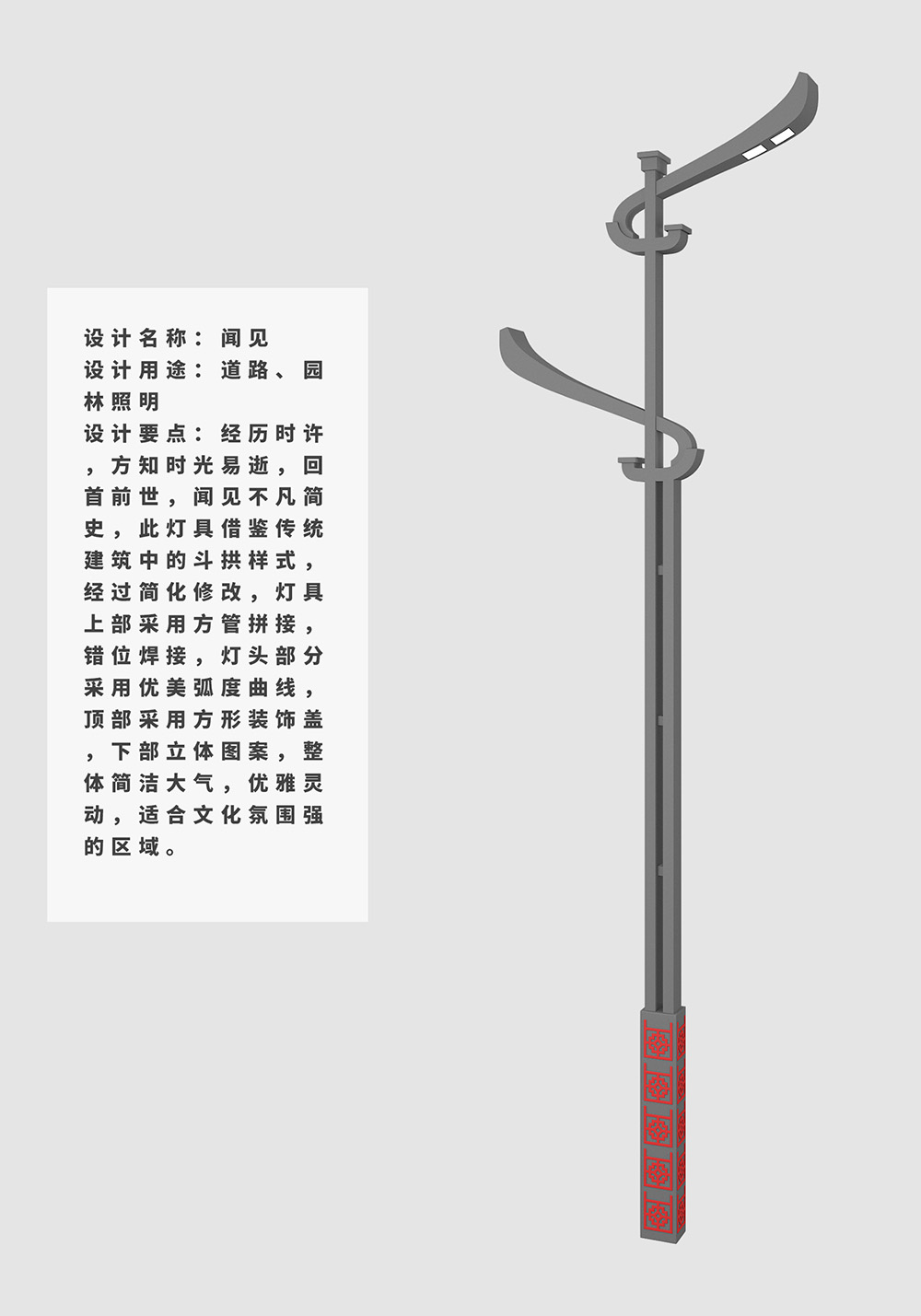 設計要點:經(jīng)歷時許,方知時光易逝,回首前世,聞見不凡簡史,此燈具借鑒傳統(tǒng)建筑中的斗拱樣式,經(jīng)過簡化修改,燈具上部采用方管拼接,錯位焊接,燈頭部分采用優(yōu)美弧度曲線,頂部采用方形裝飾蓋,下部立體圖案,整體簡潔大氣,優(yōu)雅靈動,適合文化氛圍強的區(qū)域。
